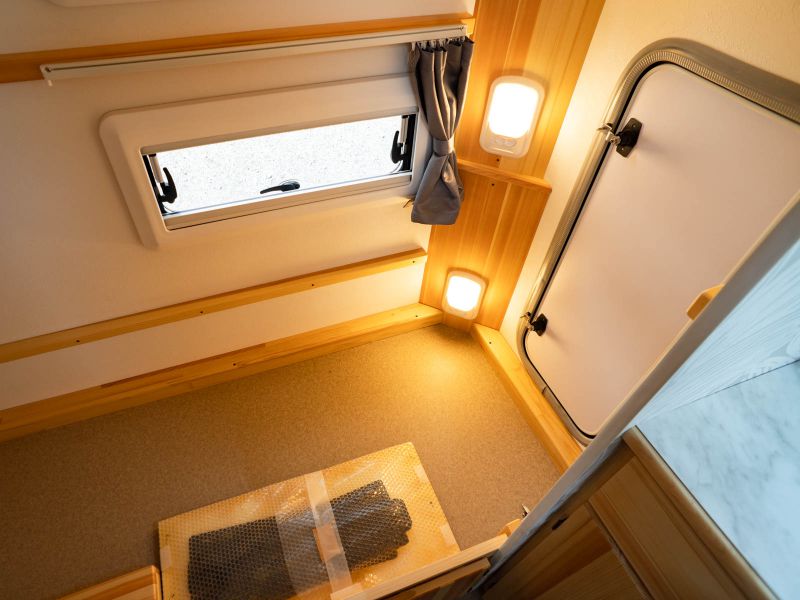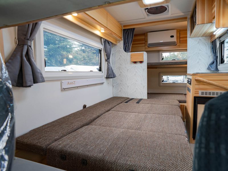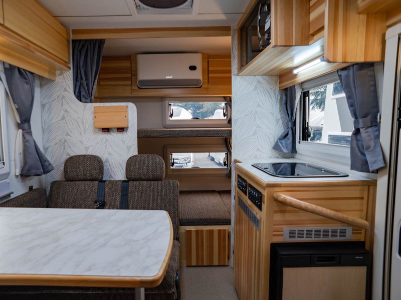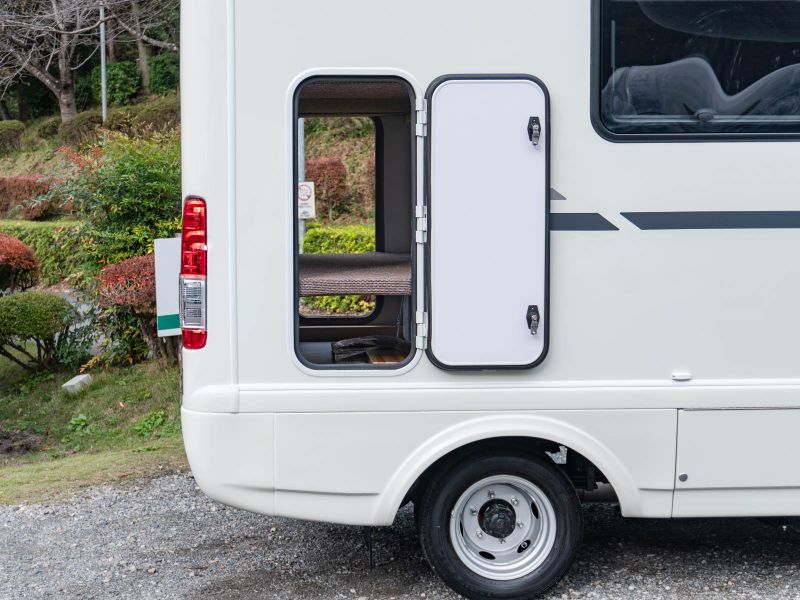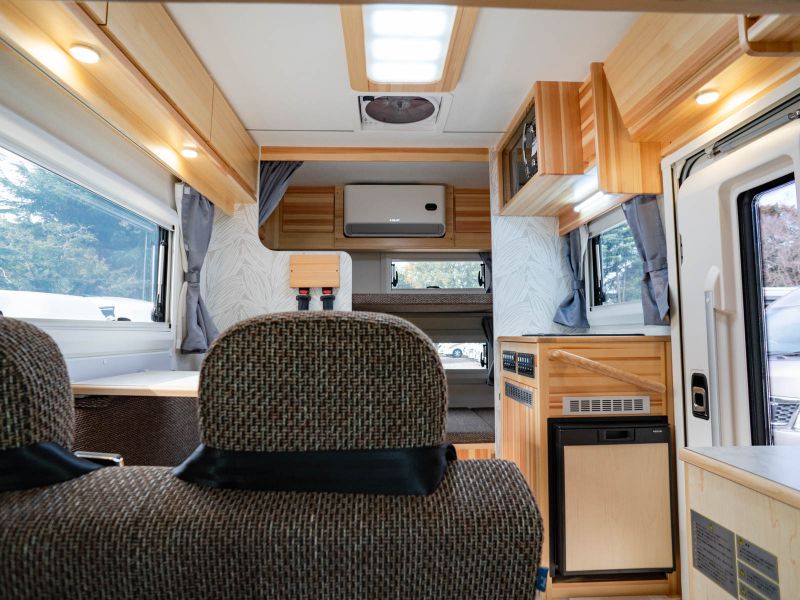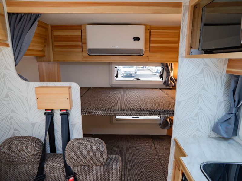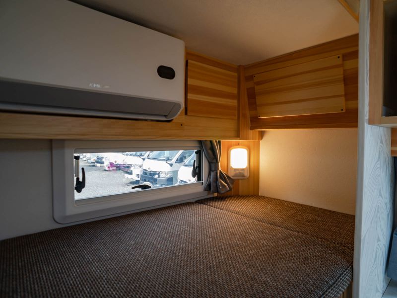 マルチルームレスで対座ダイネットとリアの2段ベッドの組み合わせでにすることで短い全長を可能にしました!コンパクトなボディに充実装備のキャブコンです。アールブイランド本社でご見学いただけます!