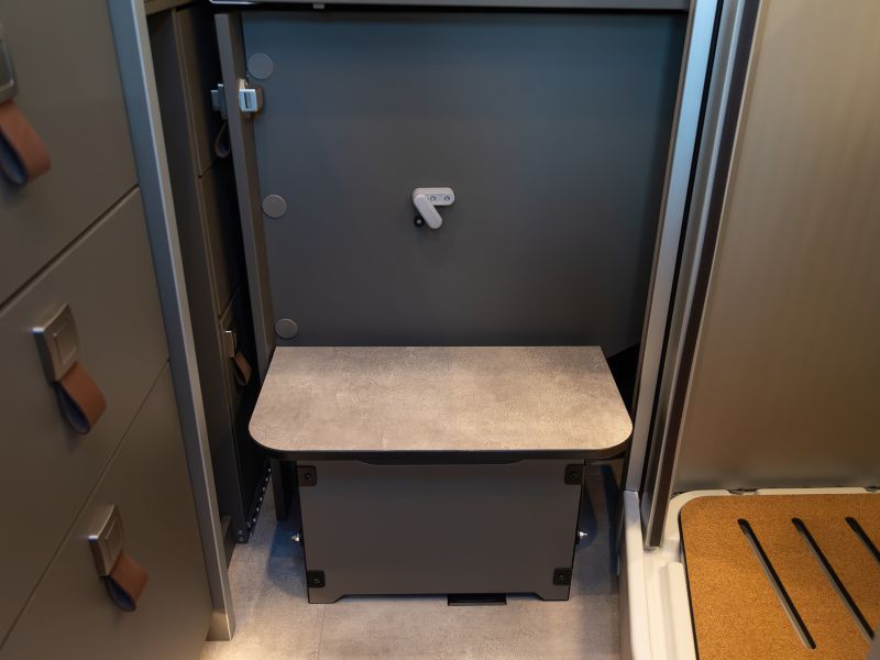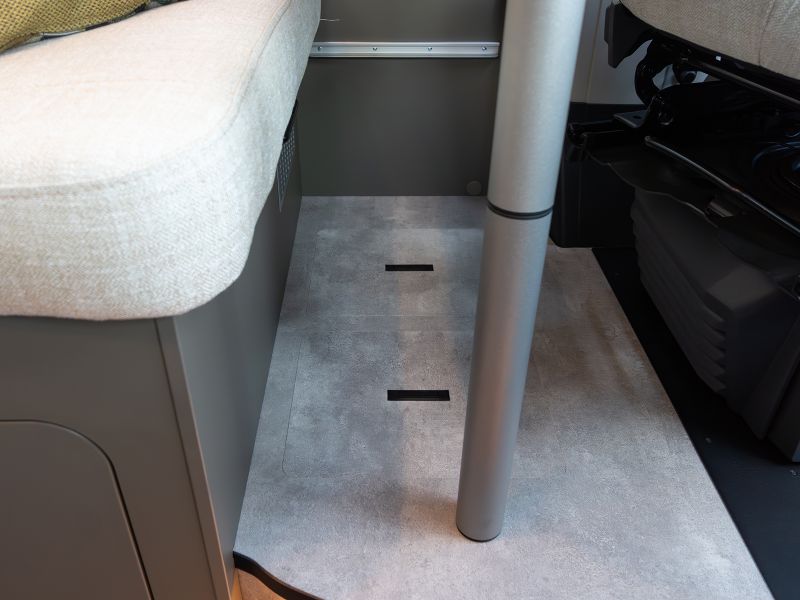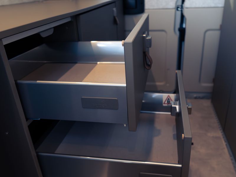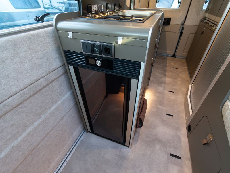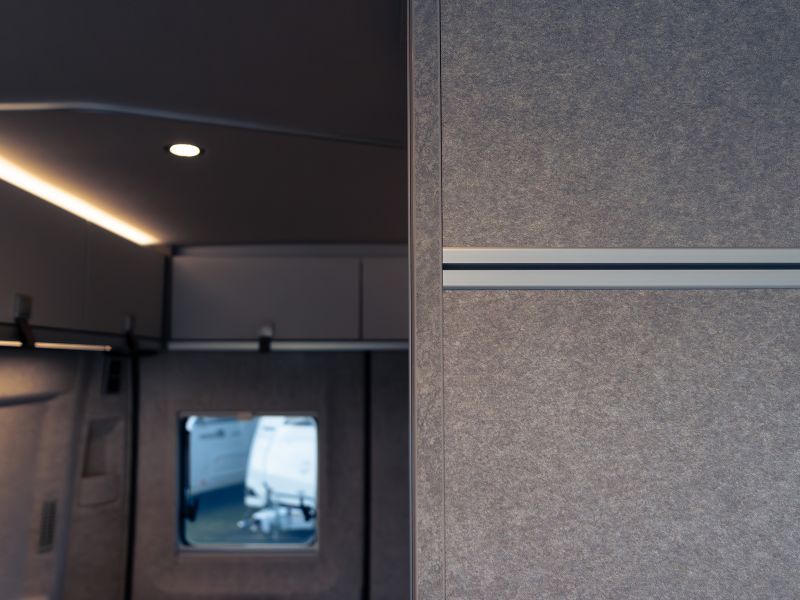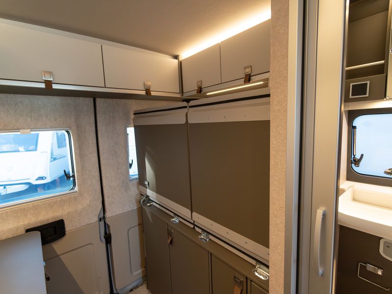 スタイリッシュなインテリアデザインは、HYMERモーターホームやERIBAトレーラーに通じます。
