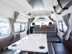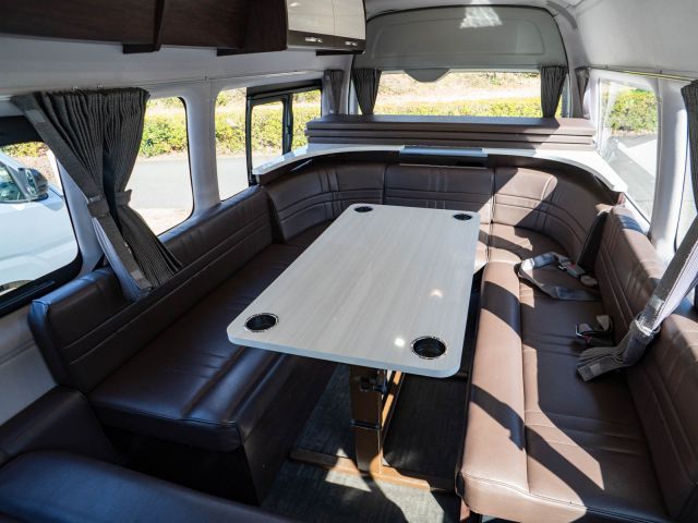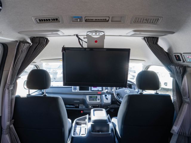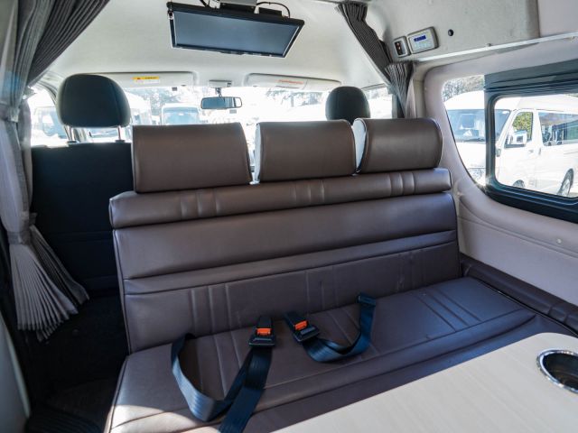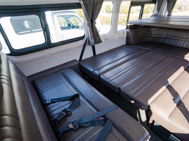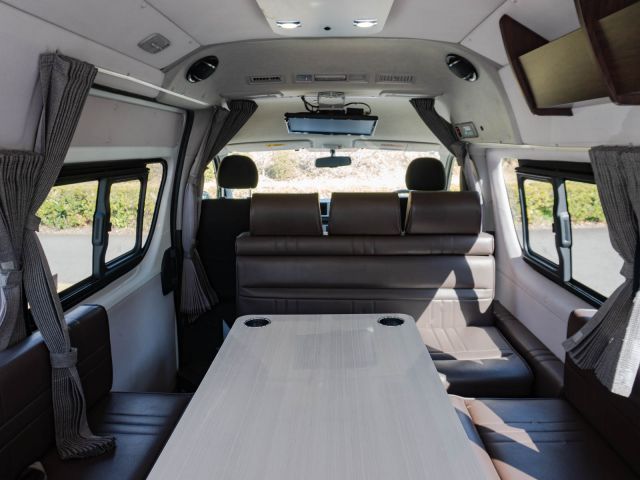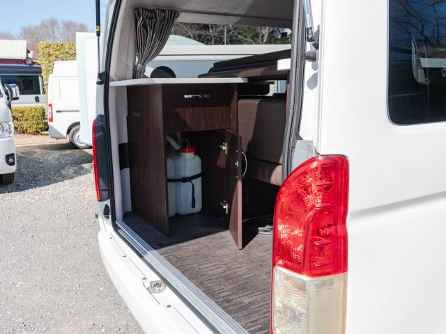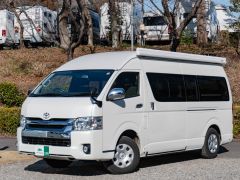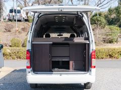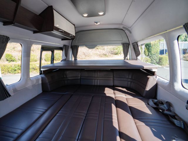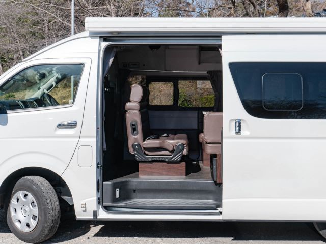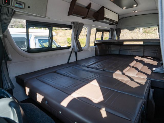 初年度登録令和2年、ガソリン4WD、トヨタハイエースキャンパー特装ベースのバンコン、アールブイランドの「ランドワゴン リノ」入庫しました。レンタルUPの車両です。大人数で移動ができて、週hシンジにはキャンパー部分ほぼ全体をベッド展開できます。オプションのエキストラベッド(2段ベッド)も装着済みの車両です。