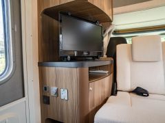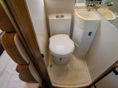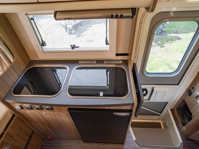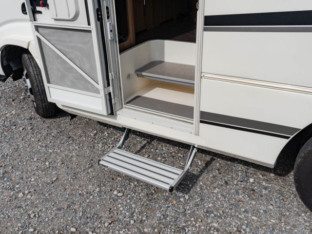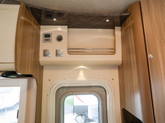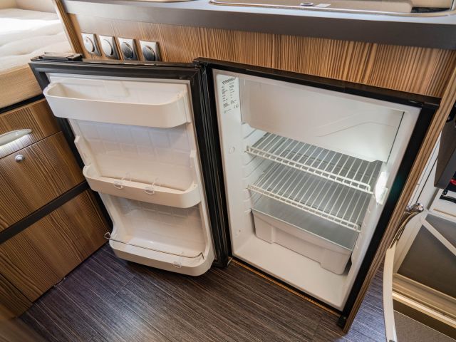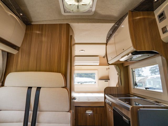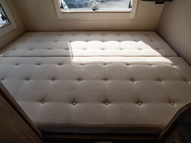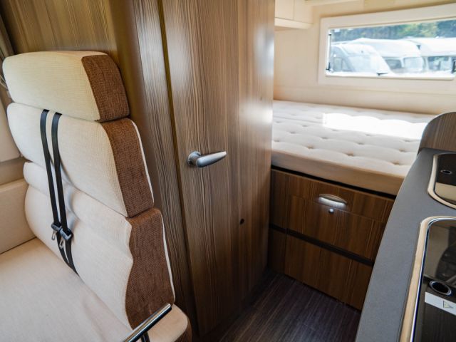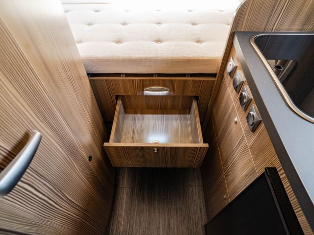 1400mm幅の大型ダブルベッドが常設されており、贅沢な装備が最上級の満足感と快適さを生み出します。たっぷりの収納と広い室内空間で長期間のご旅行にもご満足いただける一台です。