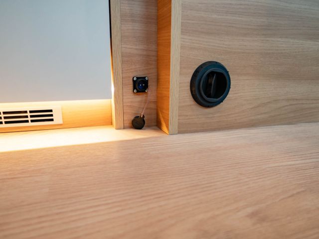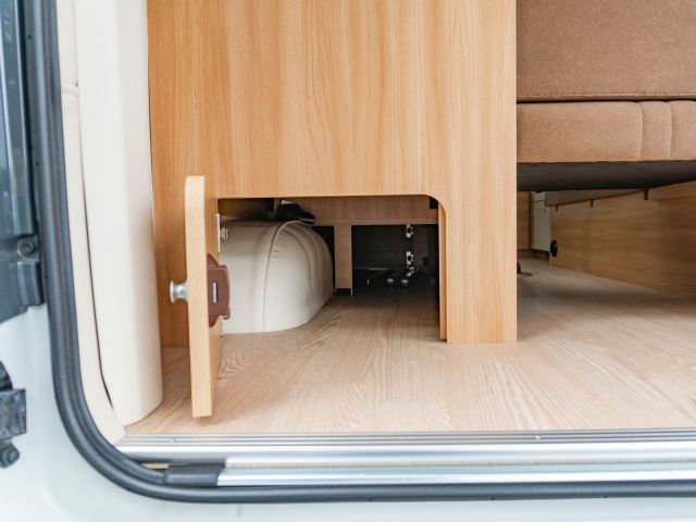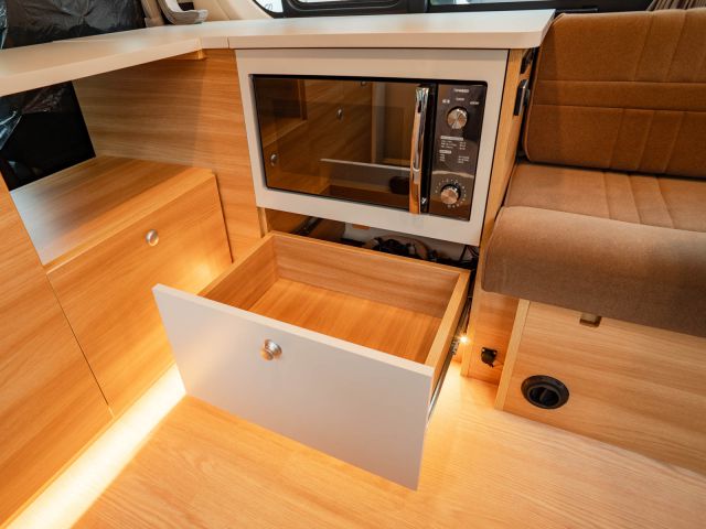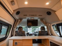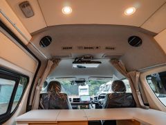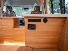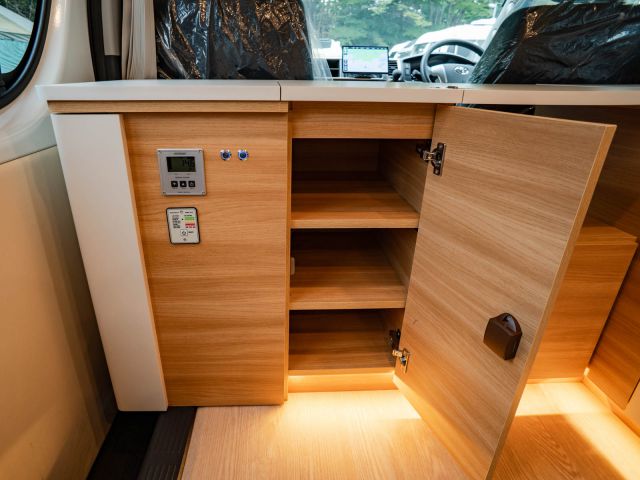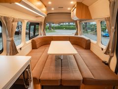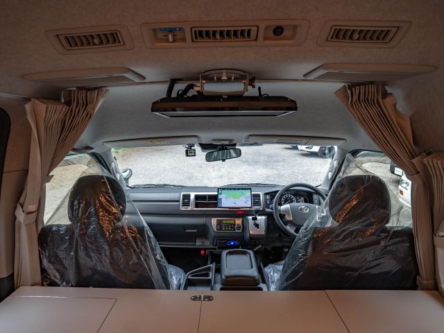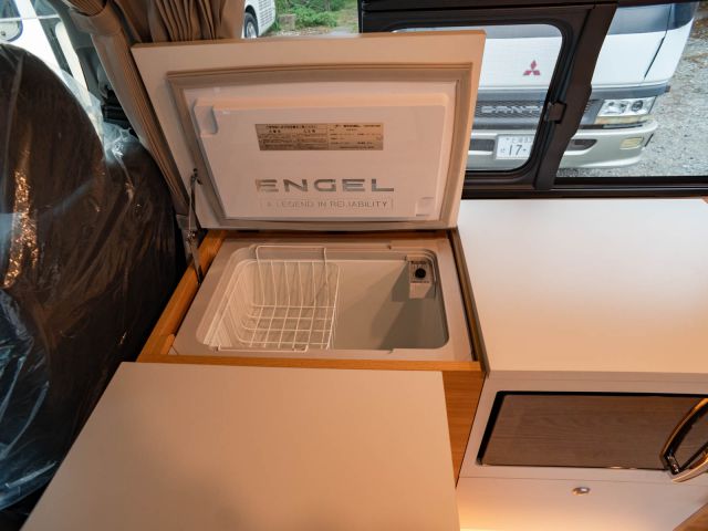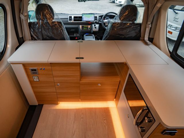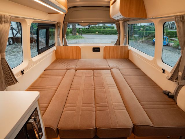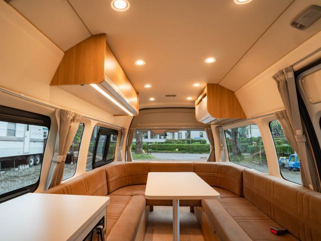 使いやすさと居心地の良さを徹底的に追求し、上質で快適な空間を実現したアールブイランドオリジナル車両。広く開放的な室内にはU字型ラウンジソファを配置し、展開すればゆったりとくつろげるベッドスペースとして活用できます。サッシ式網戸や電動ステップに加えて、家庭用エアコン・ポータブル電源入力ポート装着済。