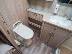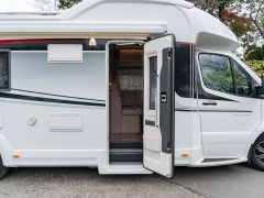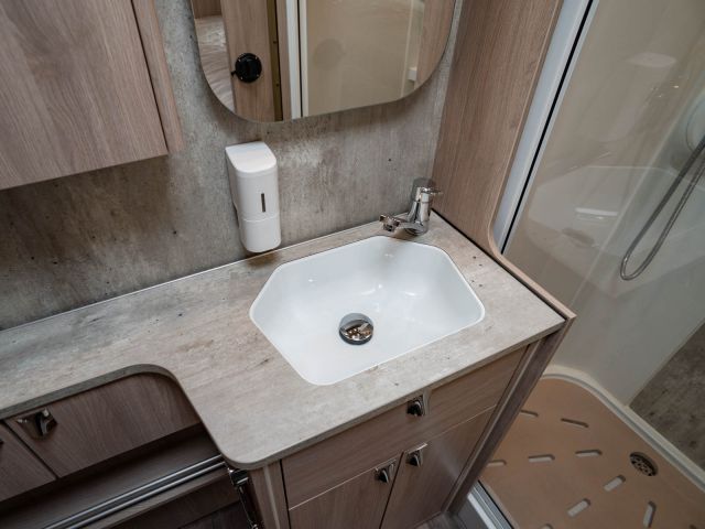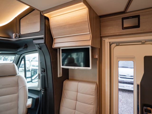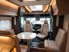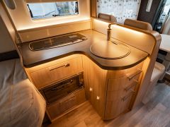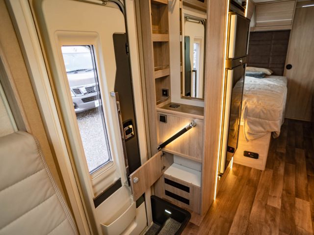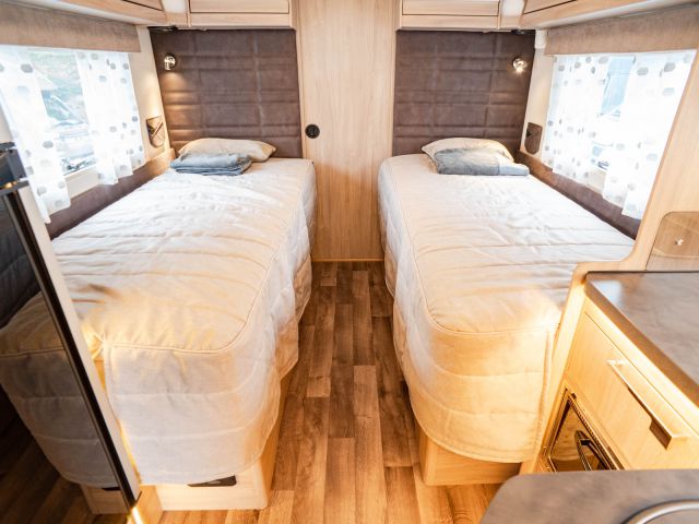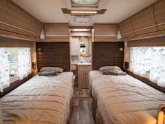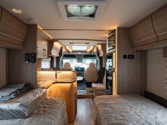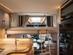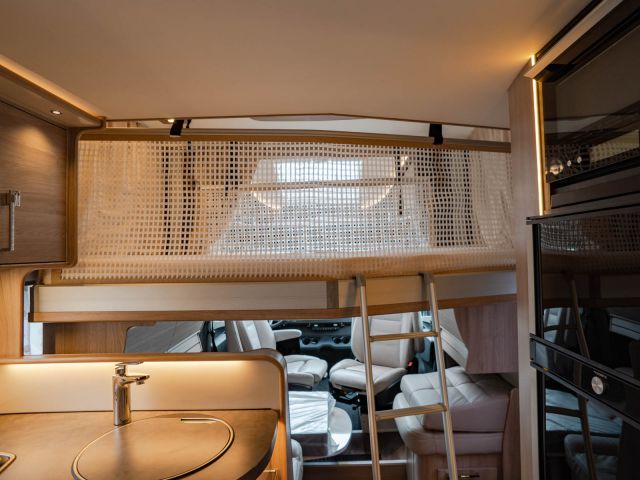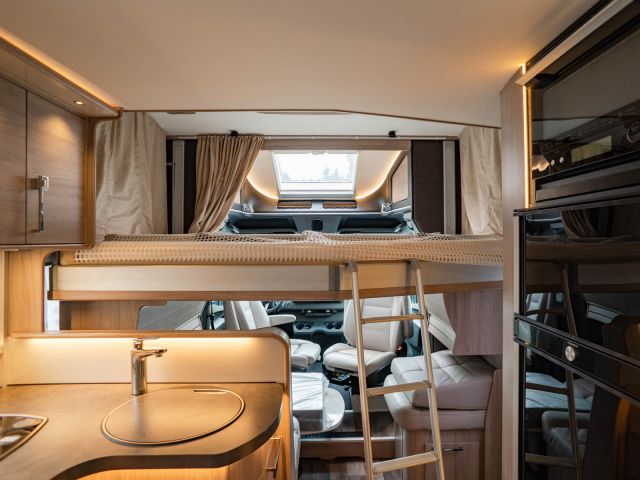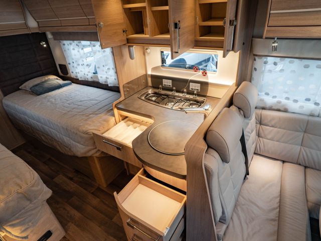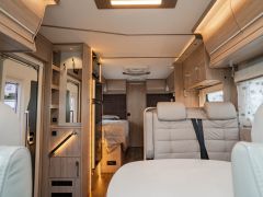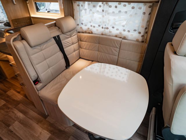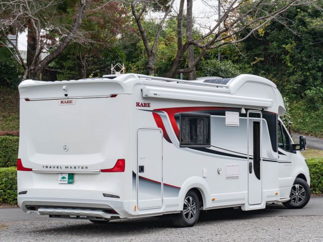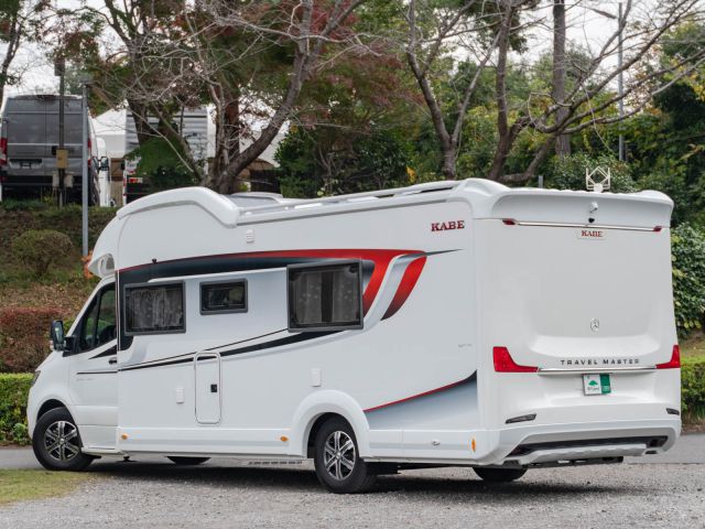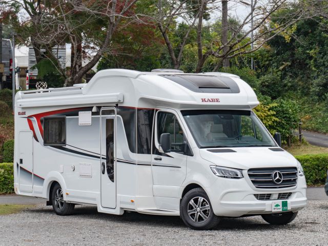 スウェーデンのKABEが手がけたモーターホーム「ロイヤル X780 LGB」が入庫しました。メルセデス・ベンツ スプリンター(ディーゼル2WD)ベース。全長約8m・全幅約2.5mのゆとりあるボディに、上質な家具が調和し、上品で快適な室内空間を演出しています。常設のツインベッドに加え、ダイネット上部には2名就寝可能なプルダウンベッドを装備。後方にはトイレと独立シャワールームを備え、快適性と機能性を高いレベルで両立しています。