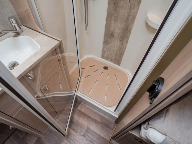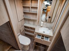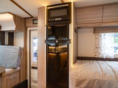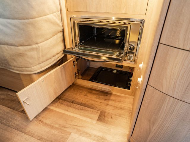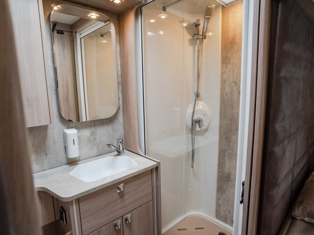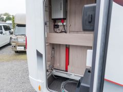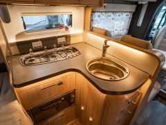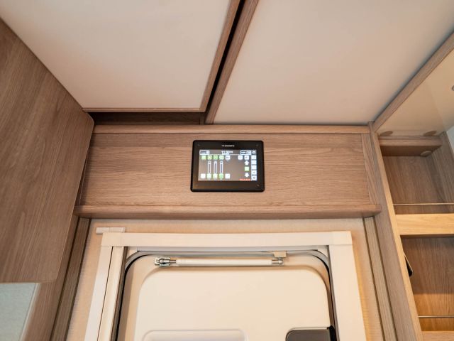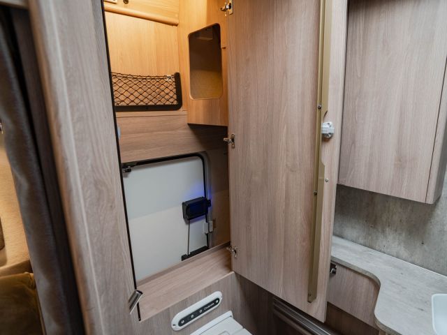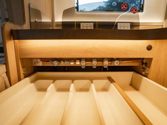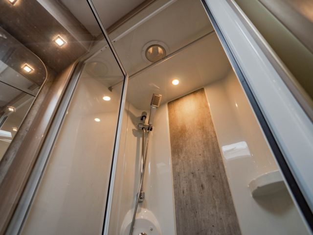 電動プルダウンベッド、油圧式安定ジャッキ、スカイルーフウインドウ、ルーフエアコン用230Vインバーター、レンジフード、ポーチライト、外部シャワー、LPボンベ8kg×2