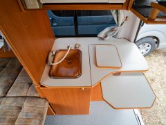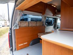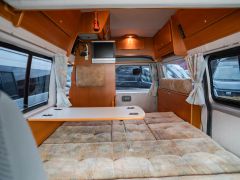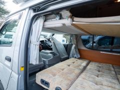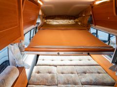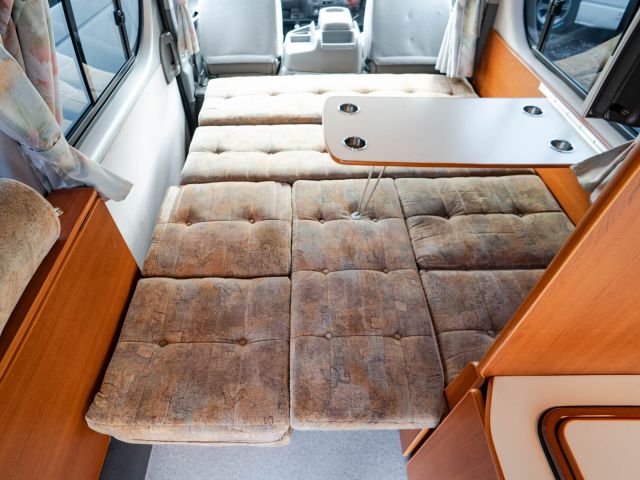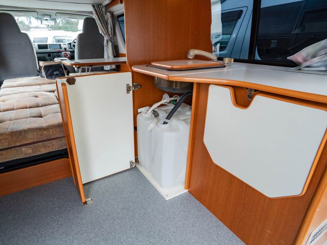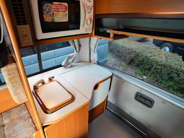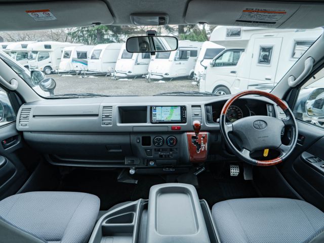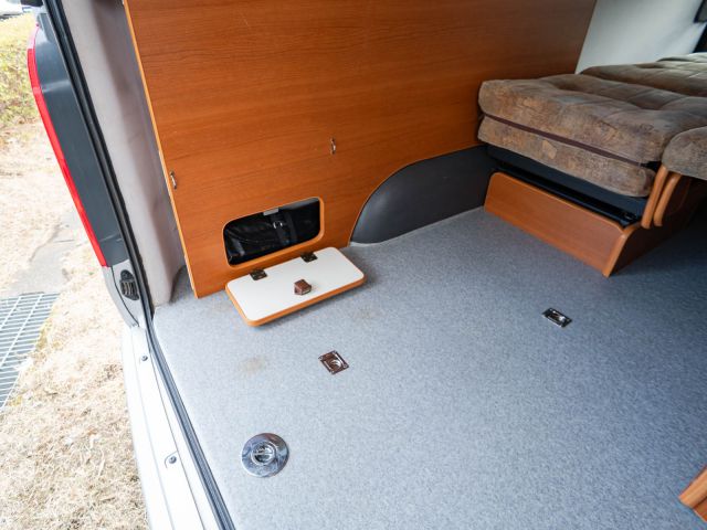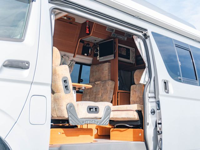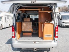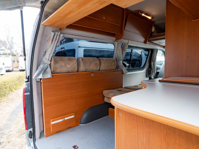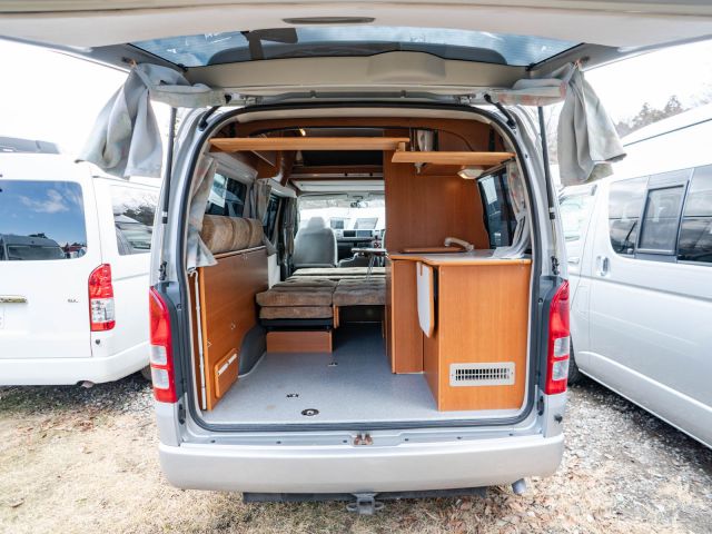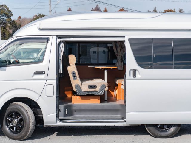 ハイエースにハイルーフ架装されていて、ゆったりとした居住スペースを確保。リアにキッチン、収納、マルチスペースを配置。プルダウン式のバンクベットも搭載!就寝スペースが必要ないデイキャンプから宿泊キャンプまで幅広く対応できる車両です。 5mを切るミニバンサイズ&ハイエースのシルエットで、車内の移動が楽なバンコンをお探しの方必見です。