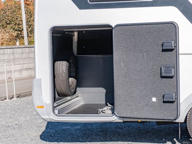 ミラー型ドラレコ(リアのみ)、ナビ電源切替スイッチ、LPボンベ8kg×2、リヤエアサス、アラウンドビューモニター