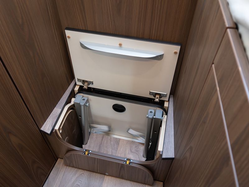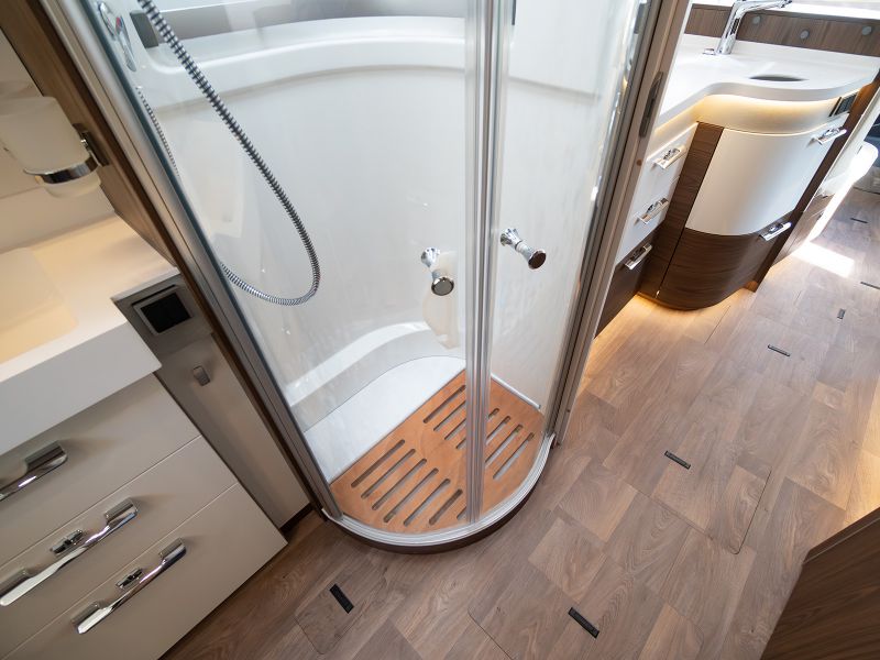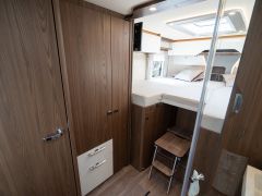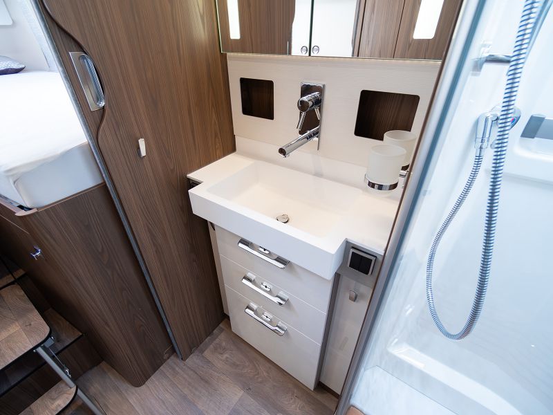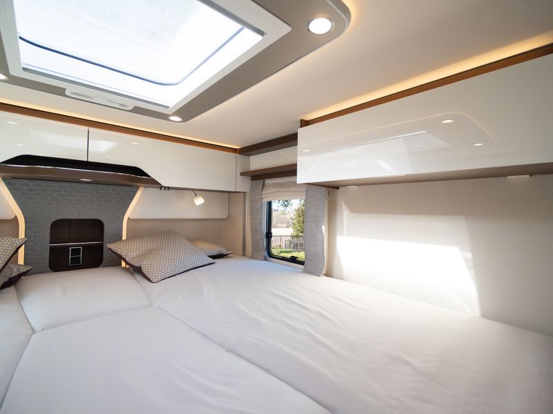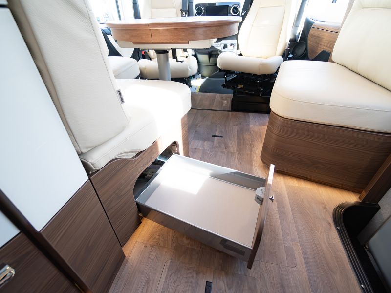 全長約9m、リヤ2軸の堂々たるインテグラルモデル。最高峰モーターホームにふさわしく、リビング、サニタリーエリア、ベッドエリアがそれぞれ区分けできるインテリアレイアウト。L字型のキッチンはまさにモーターホームと呼べる装備で、独立した洗面台はB-MLI880の高級感を際立たせています。さらにレアで優雅さ抜群のプルダウンベッドレス仕様です。HYMERモーターホームのフラッグシップモデルで最高の旅をお楽しみください。