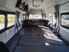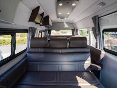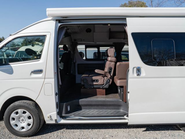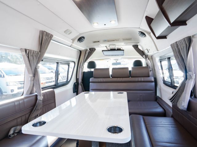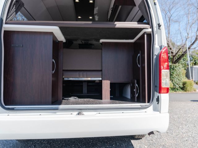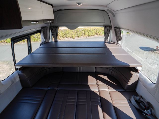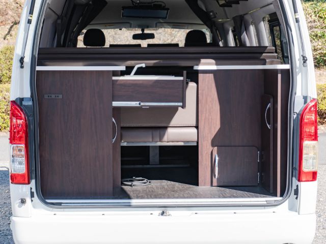 初年度登録令和2年、ガソリン4WD、トヨタハイエースキャンパー特装ベースのバンコン、アールブイランドの「ランドワゴン リノ」入庫しました。レンタルUPの車両です。大人数で移動ができて、週hシンジにはキャンパー部分ほぼ全体をベッド展開できます。オプションのエキストラベッド(2段ベッド)も装着済みの車両です。