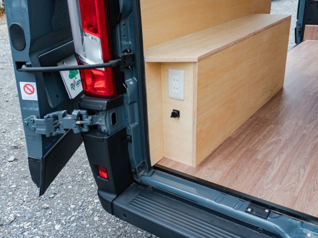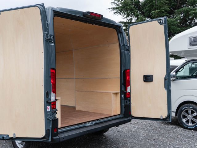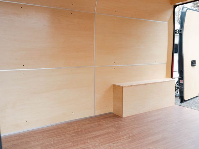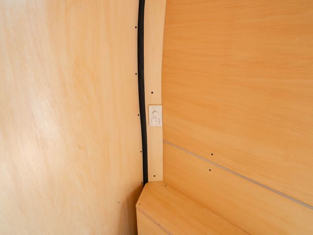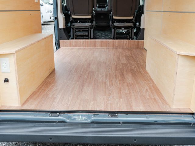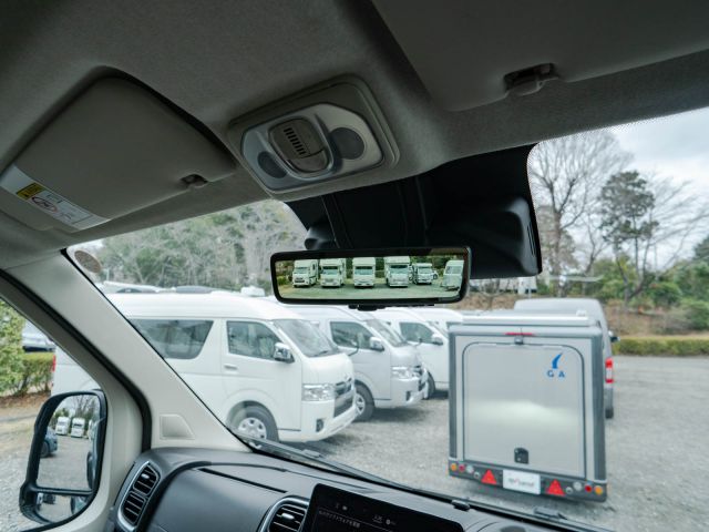 高断熱・防音制震加工(天井・側面)、荷室フロアー全面断熱4層塗装、シナベニア材貼り(天井・側面)、床全面クッションフロア、室内LED照明×8ヶ所、室内外部AC入力×1、室内ACコンセント(2口)×1