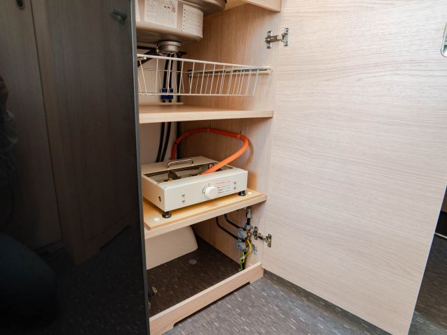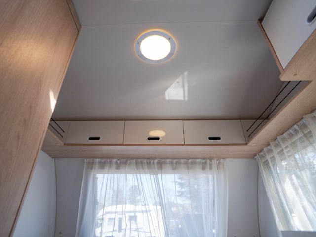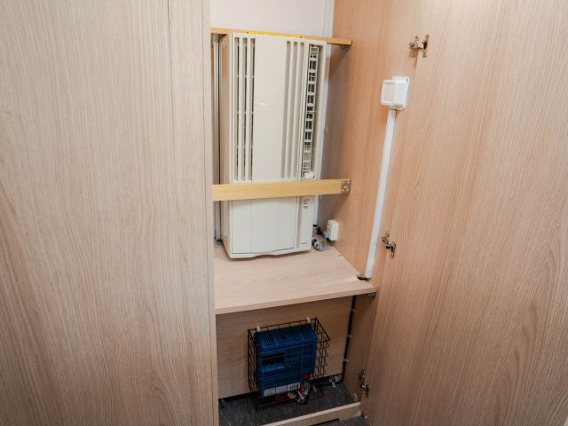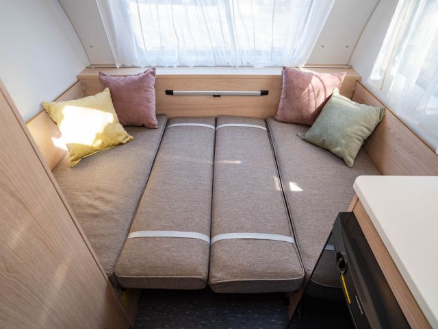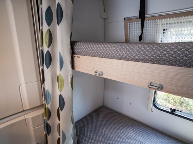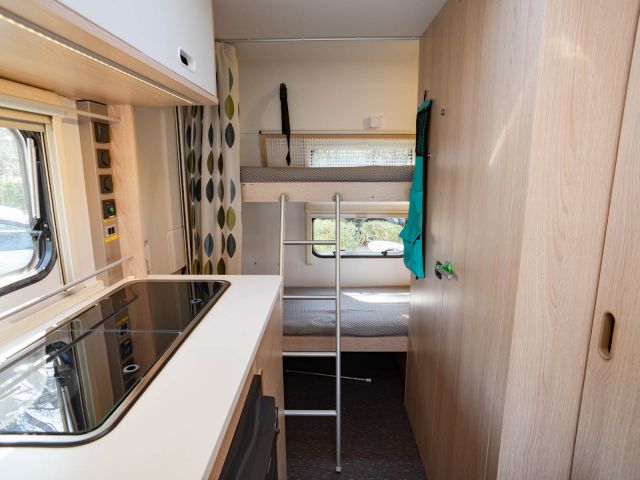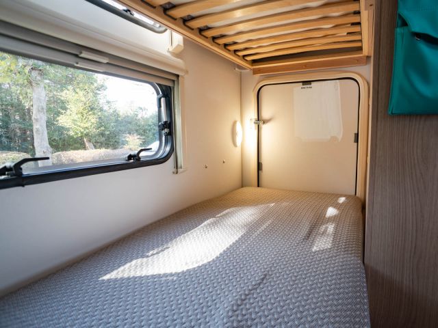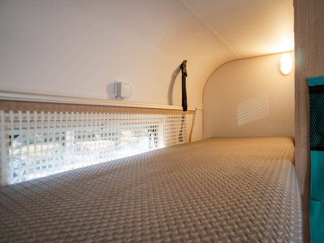 フロント側の4人掛けのソファをベッドメイクすると大人2人の就寝が可能になり、後部は二段ベッドとなっていますので大人4人が就寝可能です。ウィンドウエアコン装着済。