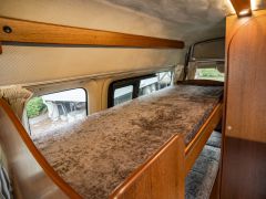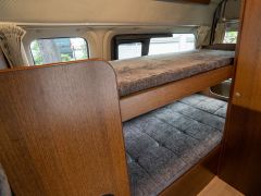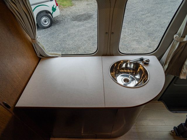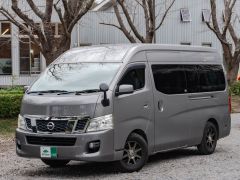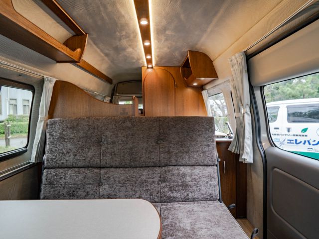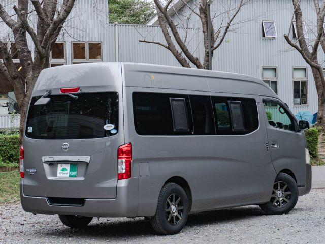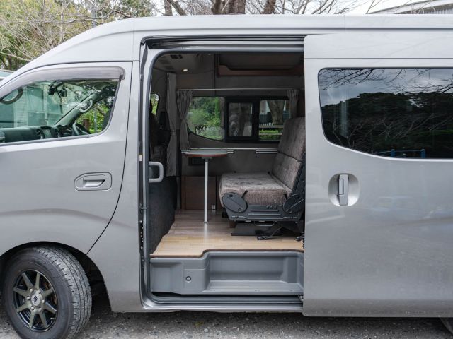 日産NV350キャラバン、ガソリン2WDベースのバンコン、ビークルの「グランベル」が入庫しました。走行中、前向きで3人座れるセカンドシートは前後どちら向きにもセット可能。カセットトイレを設置したマルチルームと常設二段ベッドが後方にレイアウトされています。疲れたらダイネットからそのままベッドで就寝可能。初年度登録平成28年で年式相応の使用感はありますが、しっかりとした内装の仕上がりと堅牢さは健在です。