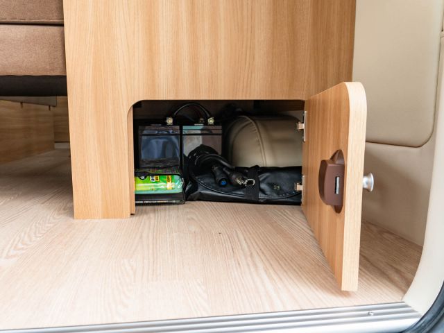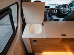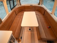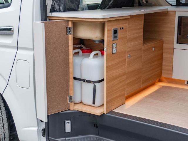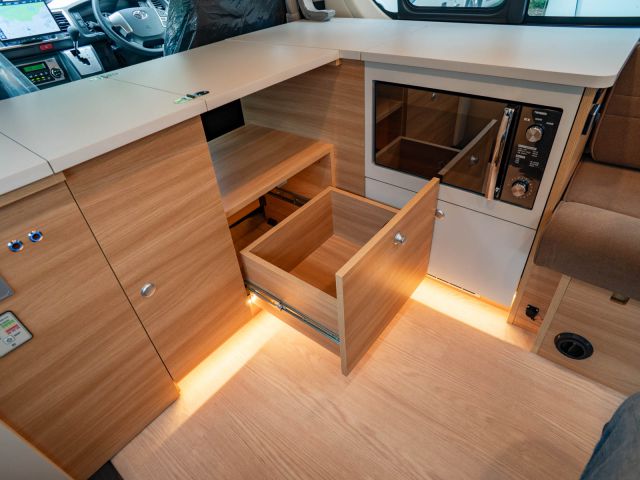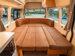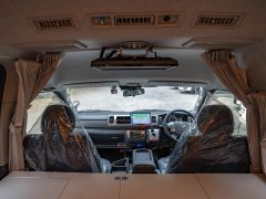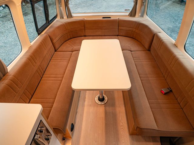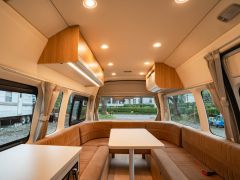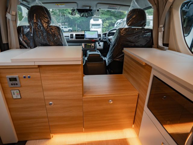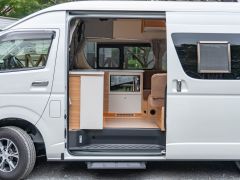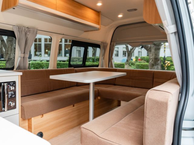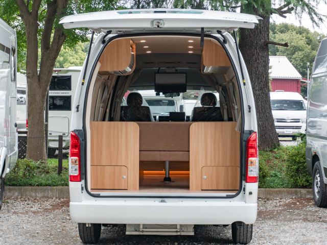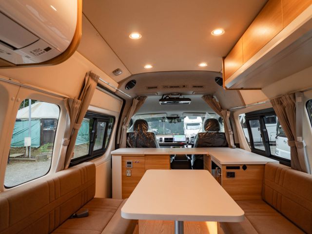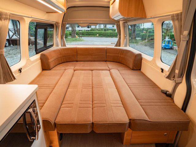 使いやすさと居心地の良さを徹底的に追求し、上質で快適な空間を実現したアールブイランドオリジナル車両。広く開放的な室内にはU字型ラウンジソファを配置し、展開すればゆったりとくつろげるベッドスペースとして活用できます。サッシ式網戸や電動ステップに加えて、家庭用エアコン・ポータブル電源入力ポート装着済。