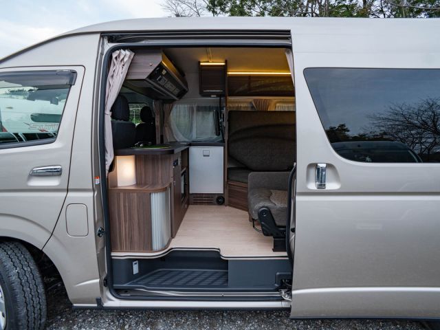 新車の納期が長期になっているハイエースベースのキャンピングカー。すぐに乗れる高年式のハイエースベースバンコン&エアコン・リチウム仕様をお探しの方いかがでしょうか!走行距離少なめ・装備充実の一台です。