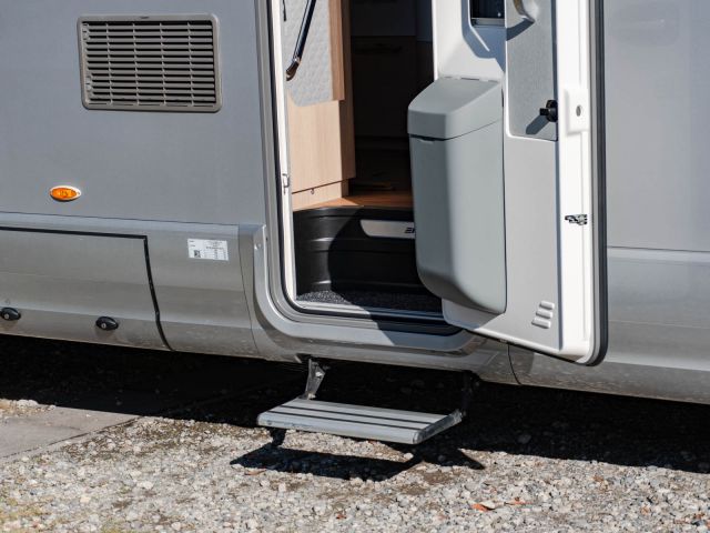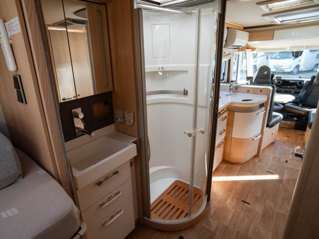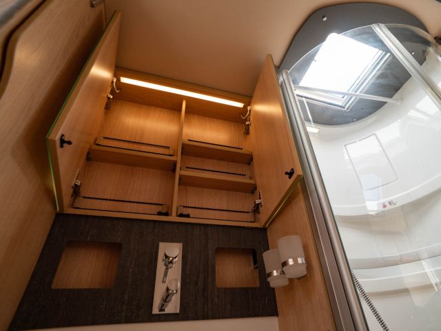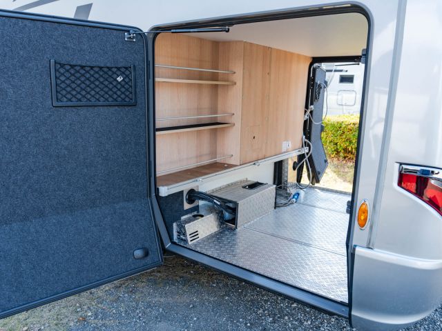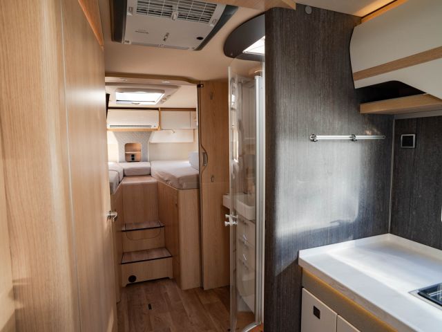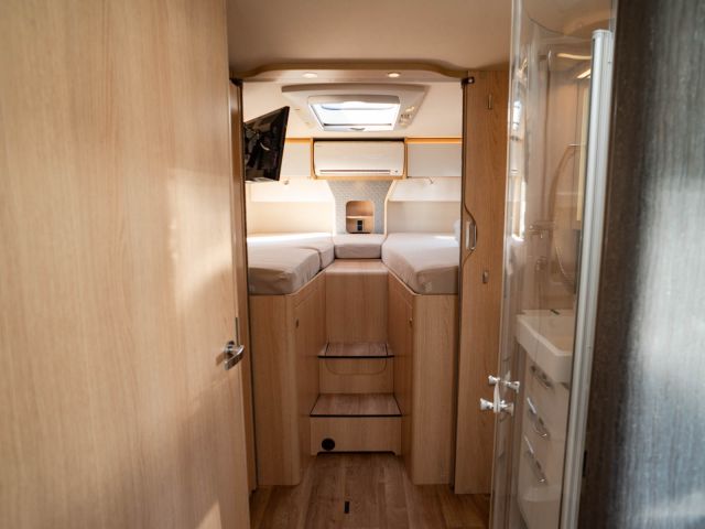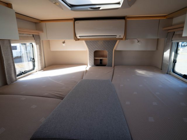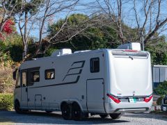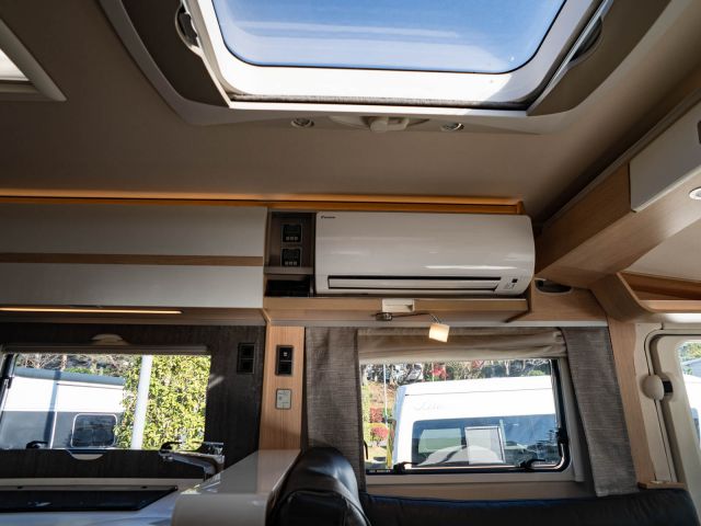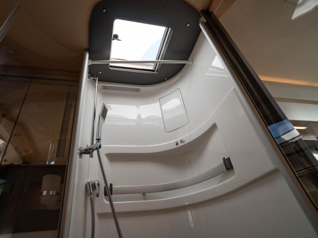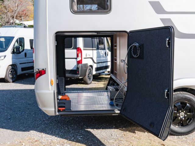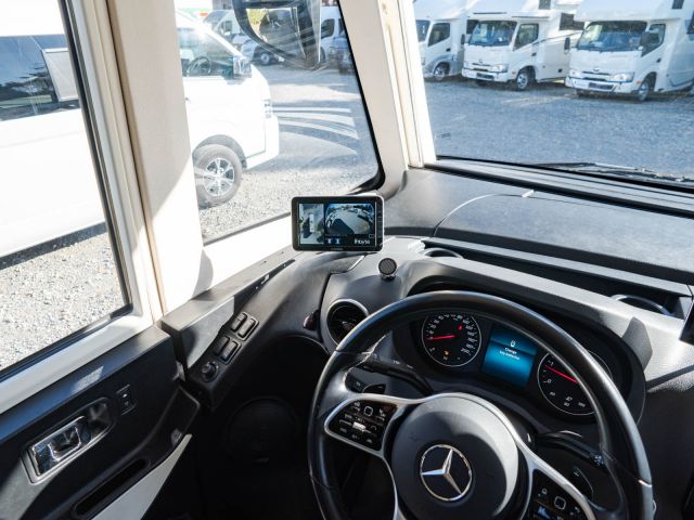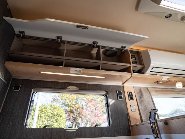 エントランス電動ステップ、スカイルーフウインドウ×2、電動フロントブラインド、手動プルダウンベッド、外部シャワー、LPボンベ8kg×2