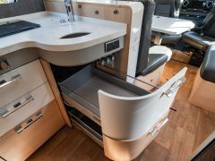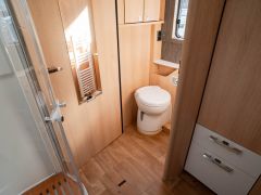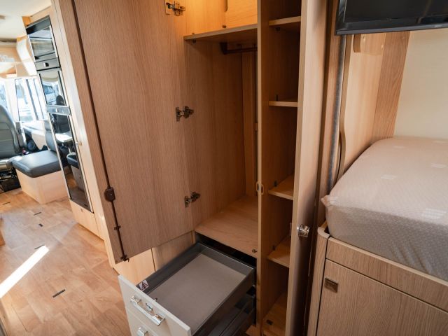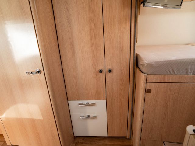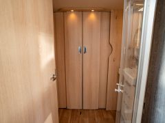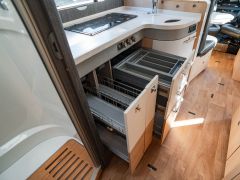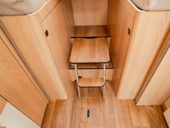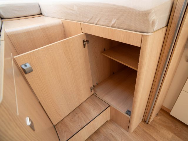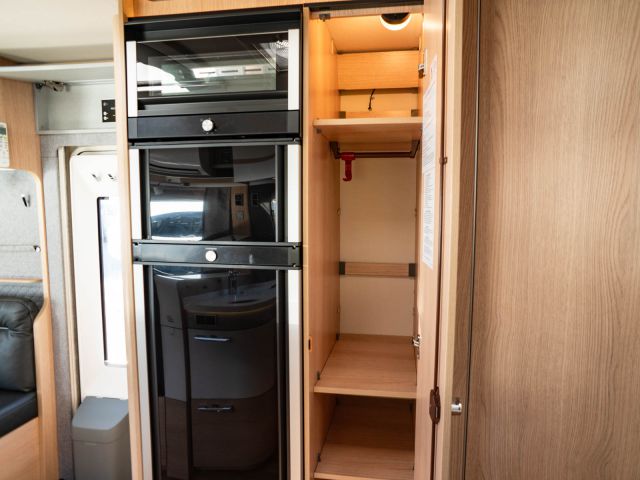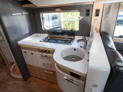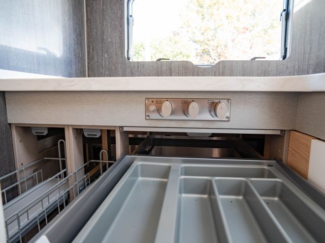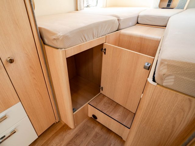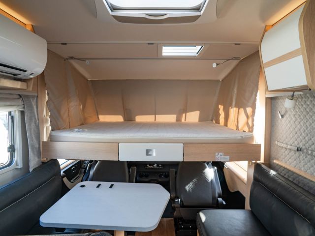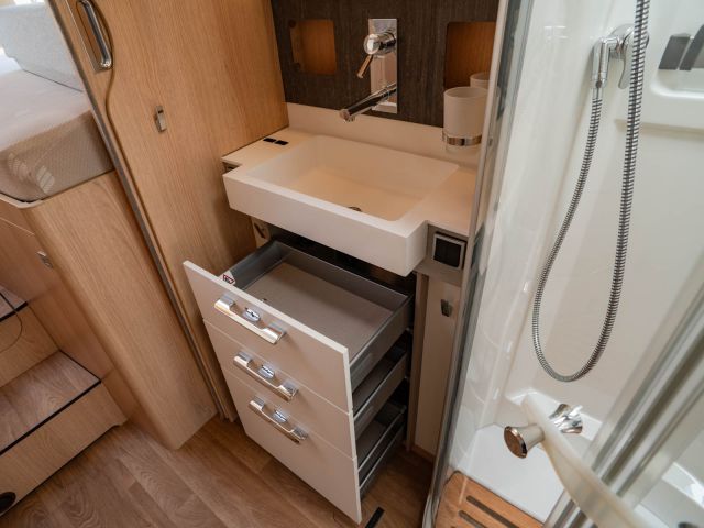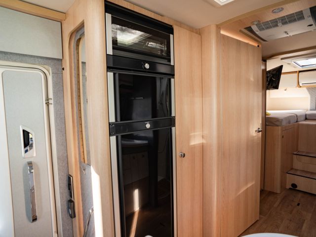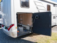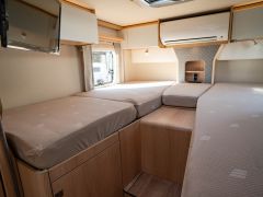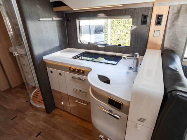 エントランス電動ステップ、スカイルーフウインドウ×2、電動フロントブラインド、手動プルダウンベッド、外部シャワー、LPボンベ8kg×2